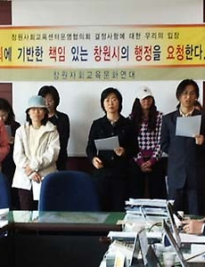 자료실/2005-2009 활동165 중앙사회교육센터 어머니학교 개강 2004년 한국교육개발원 평생교육센터 사업으로 지정받아 운영되었던 '기쁨찾는 인생 즐거운 어머니학교가' 2005년 4월 1일 개강되었습니다. 어머니 학교는 지역 분들의 후원으로 운영되고 있습니다. 2005. 4. 4. 창사련기자회견 / 신뢰에 기반한 책임있는 창원시의 행정을 요청한다. 창원사회교육센터운영협의회 결정사항에 대한 창사련 입장 신뢰에 기반한 책임있는 창원시의 행정을 요청한다? '참여를 통한 정보와 지식의 소통'이라는 과제를 해결하기 위해 시작한 마을도서관운동이 10년을 지나면서 큰 진통을 겪었다. 창원의 마을도서관은 시민사회운동으로 시작된 것이 행정에 제안되어 민관협력 사업으로 되었고 창원시민들에게는 생활 속의 소중한 공간으로 주민사랑방으로 자리매김하고 있다. 마을도서관 사업이 10년을 경과하면서 30개로 양적 성장을 이루었고, 평생학습도시 지정이라는 대외적 인정도 받았다. 그럼에도 마을도서관의 두 운영주체인 민과 관의 역할에 대한 협력모델이 정립되지 않았고, 그 제도적 틀은 너무나 취약하였다. 그러한 조건에서 금번과 같은 민과 관의 이해 상충은 불가피한 것이었고, 그 해결.. 2005. 3. 29. 동화마을 들꽃분과에서 준비한 봄꽃맞이 나들이를 장유계곡으로 다녀왔습니다. 동화마을 들꽃분과에서 준비한 봄꽃맞이 나들이를 장유계곡으로 다녀왔습니다. 아이들이 토요일임에도 학교를 가지 않는 날이었습니다. 날은 무척이나 좋았습니다. 올해는 여느 해 보다 꽃이 늦게 핍니다. 그래도, 생강나무, 얼레지, 제비꽃, 현호색, 노루귀 등이 탐스럽게 봄을 알리고 있었습니다. 참여한 아이들도 신이난 하루였습니다. 다음번에는 달천계곡으로 간다고 합니다. 차혜정 분과장님이 수고를 많이 하셨습니다. 사진은 동아리 -> 들꽃모임방에 올려져 있습니다. 2005. 3. 28. 이전 1 ··· 25 26 27 28 다음