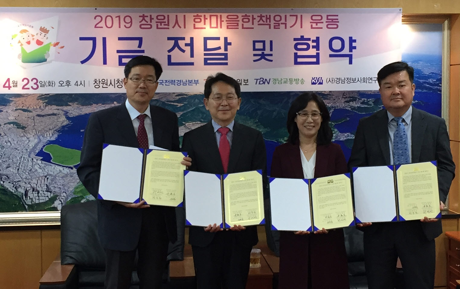 세계 책의 날이기도 한 4월23일(화) 오후 4시 창원시청 접견실에서 허성무 창원시장, 유현호 한전경남본부 본부장, 서영만 TBN경남교통방송 본부장, 임용일 경남도민일보 기획이사. 박종순 경남정보사회연구소 이사장, 이용호 창원시 기획실장, 도기창 TBN경남교통방송 편성제작국장, 이종은 경남정보사회연구소 소장, 정정연 평생교육담당관 등 관계자가 참석하여 "2019년 창원시 한마을 한책읽기 운동 기금전달 및 협약"을 하였다.