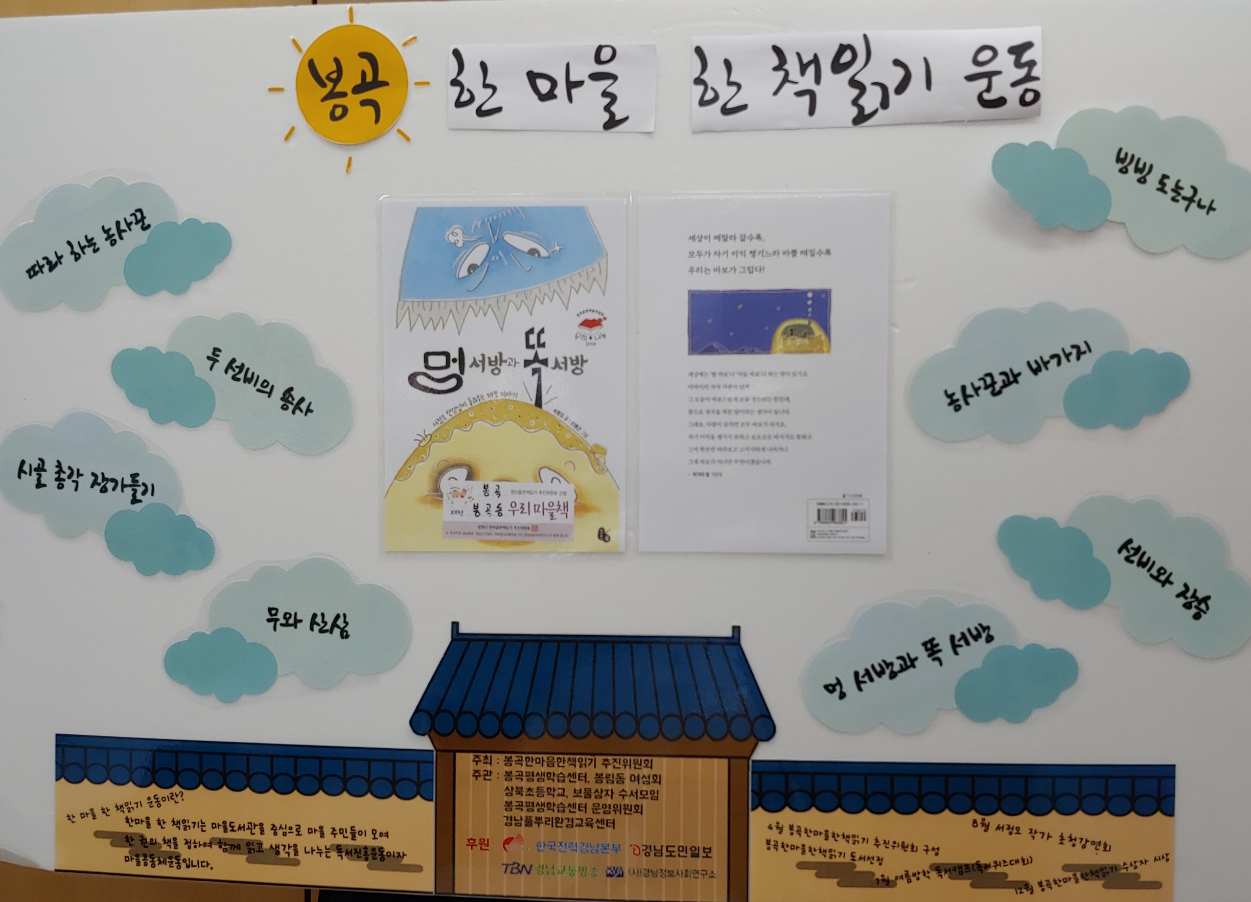 지역 경제의 어려움으로 저마다 가정마다 힘들어 하는 분들이 다양하다. 그래서 사람들의 모습에 웃음꽃이 피었으면 하는 바램을 담고 웃을 수 있고 재미가 있고 누구나 쉽게 읽을 수 있는 점을 고려하여 봉곡한마을한책읽기 추진위원회에서는 동화, 옛이야기가 담긴 도서를 선정하게 된 것이다. 동화 이야기책은 동심의 세계로 옛 추억을 떠올릴수 있다. "멍서방과 똑서방" 은 서정오 작가의 최근 작품으로 서정오 작가의 작품은 우리옛이야기 백가지 외 초등교과서에 많은 작품이 실려 있다.