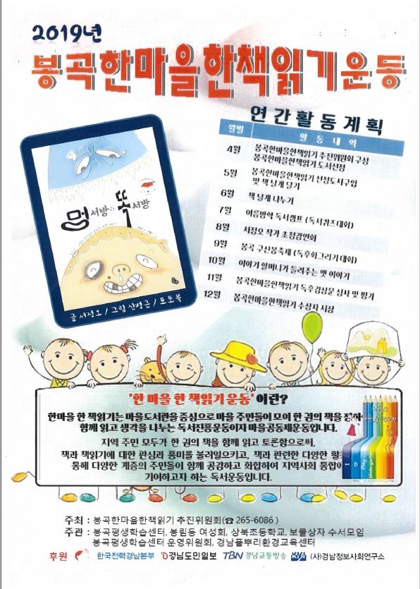 올해는 특히, 한국전력경남본부에 감사드린다. 경남정보사회연구소의 노력 결과이다. 소소한 후원 덕분에 작가초청 할 수 있어 마을에서 작가를 가까이 만나 책이야기를 나눌수 있는 소중한 시간이다. 서정오 작가초청 행사는 8월23일 금요일 오후6:30 마을도서관에서 열린다. 마을도서관 이용자분들에게 좋은 기회이다. 또한 봉곡평생학습센터(작은도서관)도 정말 좋~다!!
