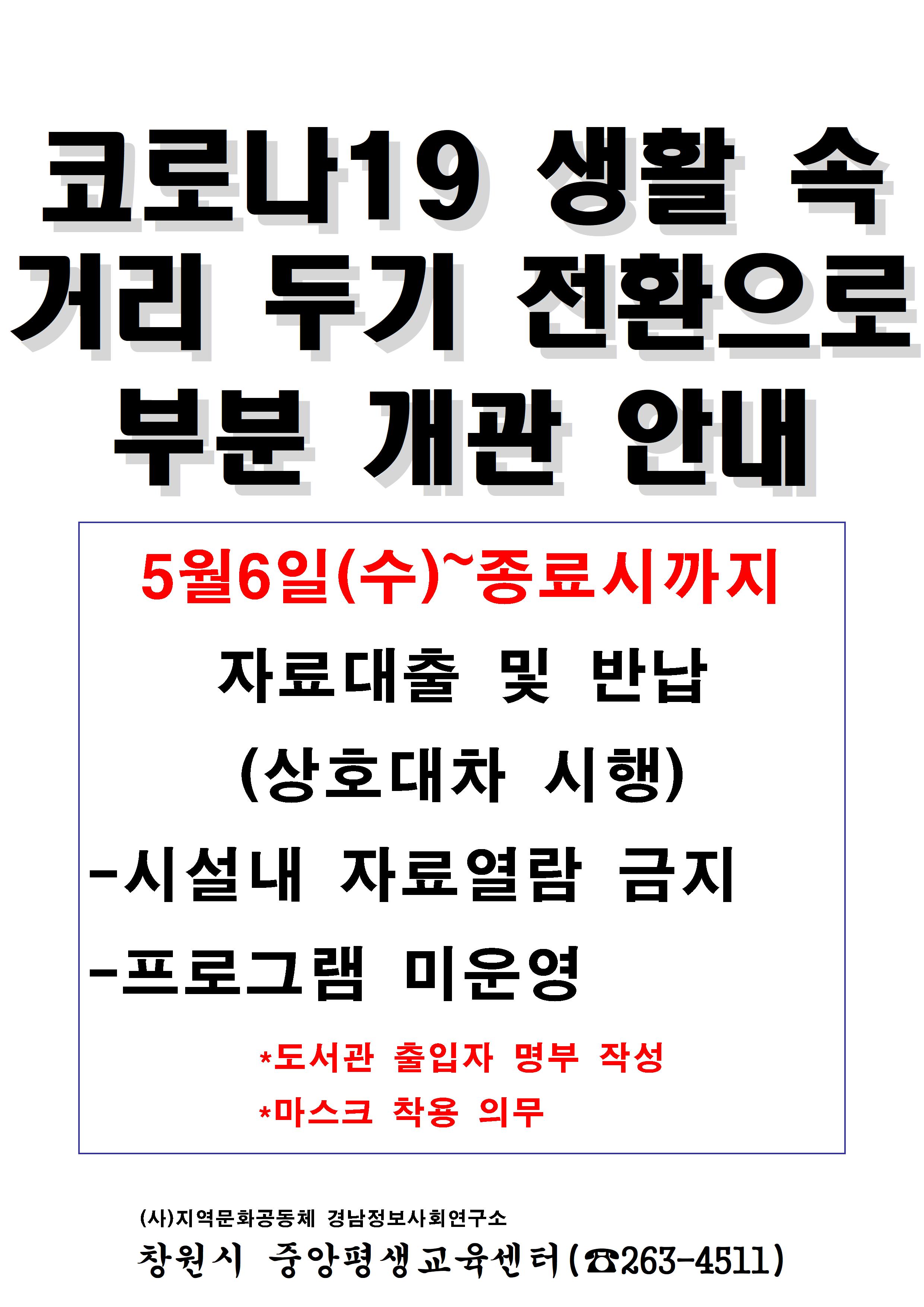 생활 속 거리두기 전환으로 부분 개관 합니다.