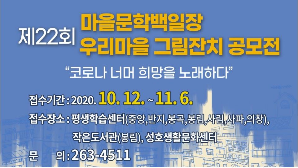 | 제22회 마을문학백일장·우리마을 그림잔치 공모전 (0) | 2020.10.09 |
