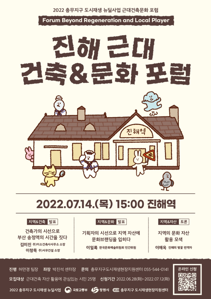 [건축과 문화가 지역으로 스며들다]가 부제입니다. 건축가와 기획자가 하나의 자산을 두고 활용하는 시선과 방안을 진해와 유사한 사례들을 바탕으로 이해해보려고 합니다. 또한 지역재생에 대한 진솔한 생각을 나누어 보는 자리가 되길 바랍니다.