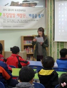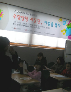 2012년 꿈다락 문화학교가 문을 열다. '우당탕탕 재잘단, 마을을 품다'라는 제목으로 3월 31일(토) 오리엔테이션을 갖다. 문화체육관광부 주최, 한국문화예술교육진흥원, 경남문화재단 주관, 사단법인 지역문화공동체 경남정보사회연구소 운영 대상은 저소득층과 맞벌이 자녀를 중심으로 초등 3학년부터 6학년 아동이다. 중앙평생교육센터에서 진행할 재잘단은 마을품기, 마을숲만나기, 마을문화유산투어, 골목디자인과 마을만들기 사례탐방, 공연 및 전시로 마무리할 예정이다. 매월 2, 4주 9시반에서 12시반까지 세시간 씩 일년동안 진행된다. 신정혜 선생님께서 오리엔테이션을 진행하다. 일년동안 진행할 사업에 대한 안내와 설명.. 일년동안 함께하실 주강사님이신 박태성 선생님의 인사.. '도시 디자인과 조형물'에 대한 특강을..